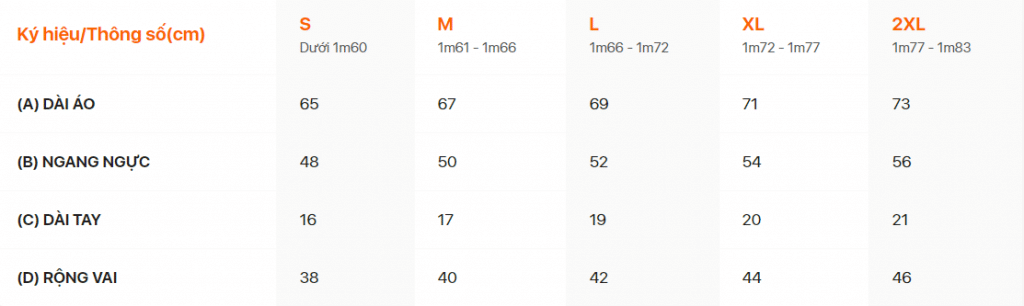 Rộng lưng | 78 | 80 | 82 | 84 | 86 | 88 | 1 |